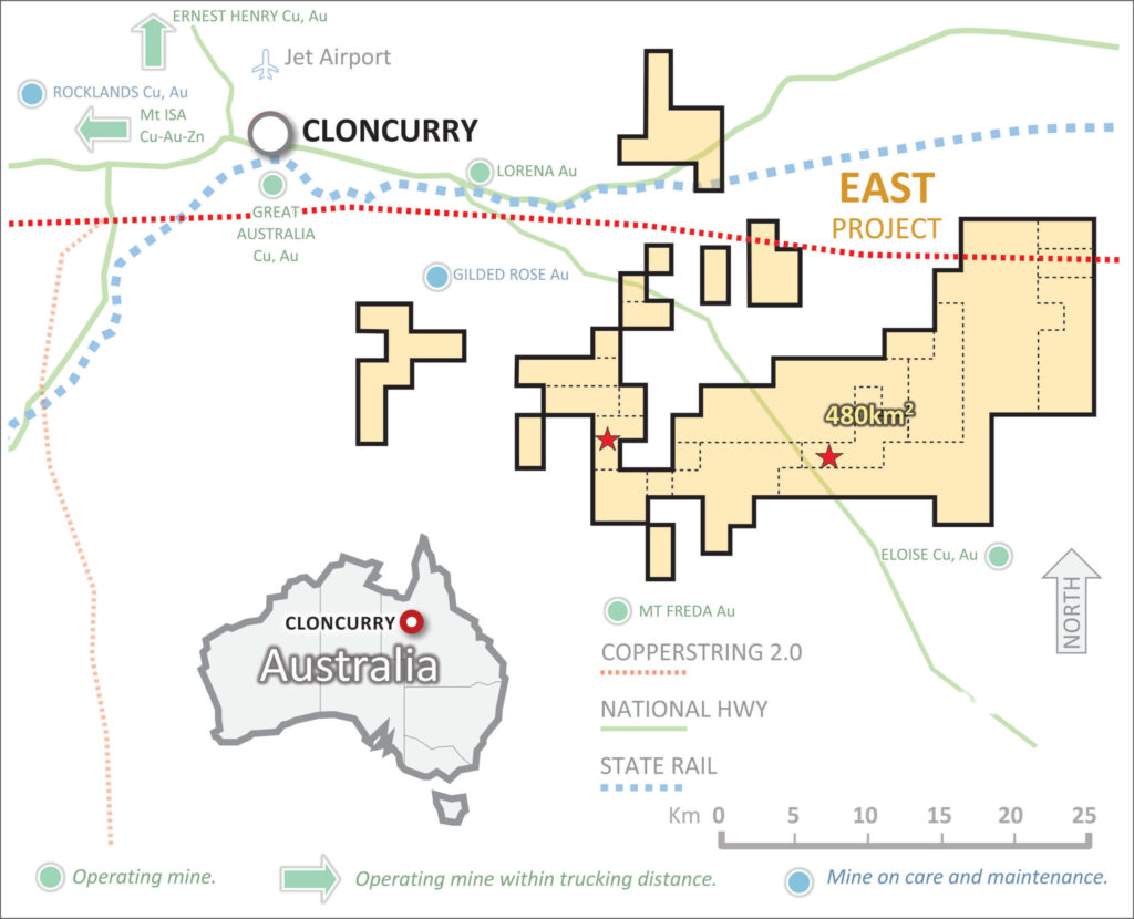 This highly prospective package of tenements is mainly located east of the Cloncurry Fault and north of the Selwyn‐Mount Dore corridor, which contains many IOCG deposits within a highly prospective belt that is bounded on the south by the Canteen “IOCG” Prospect, and on the east by the Eloise Deposit within the Soldiers Cap Group.