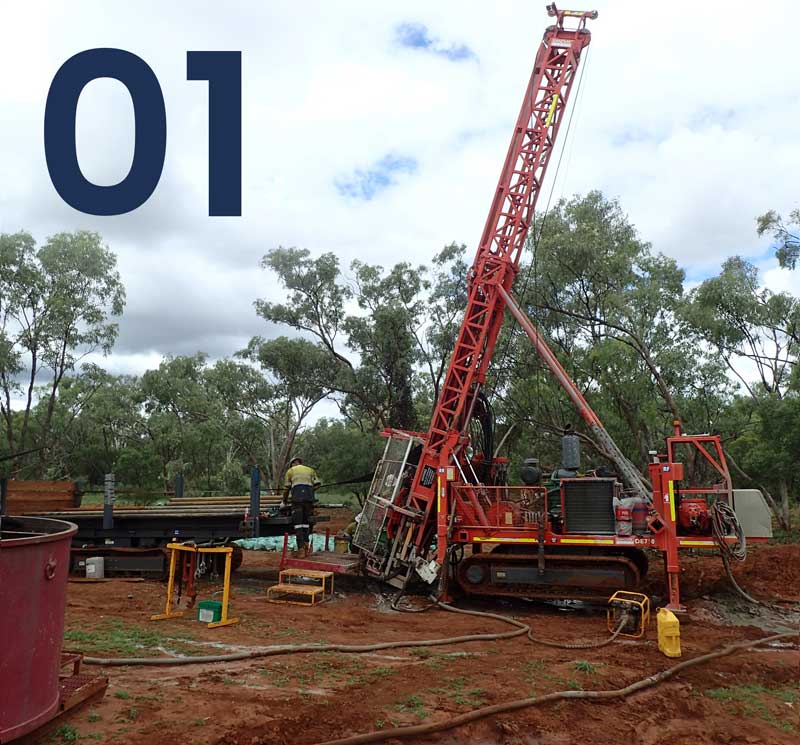 Diamond drilling, on the other hand, uses a diamond-impregnated drill bit to cut through hard rock formations. This method produces a core sample that can be analysed for mineral content and quality. Diamond drilling is often used in mining operations to extract ore samples and assess the quality of the deposit. Both drilling methods are essential for mineral exploration and extraction in Cloncurry and other mineral-rich regions around the world. This method is ideal for drilling deep holes and is commonly used for mineral exploration providing grade, mineralogical, structural and bulk density data.