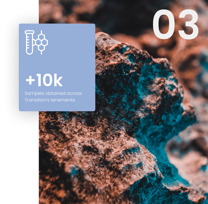 Transition Resources is acquiring high‐resolution aerial photography and digital terrain models (DTMs) of key prospect areas with impressive results. This includes the remote identification of mineralised surface rocks that are identified by post‐processing (desk‐top) assessment of areas of coverage.