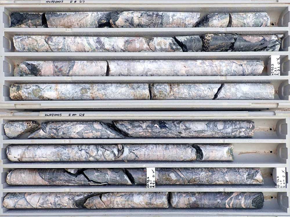 Figure 5. Example of solid drill core from diamond hole HWDD0005, highlighting part of a 10m wide sulphide- bearing, carbothermal zone (~88.6 to ~95.5m shown).