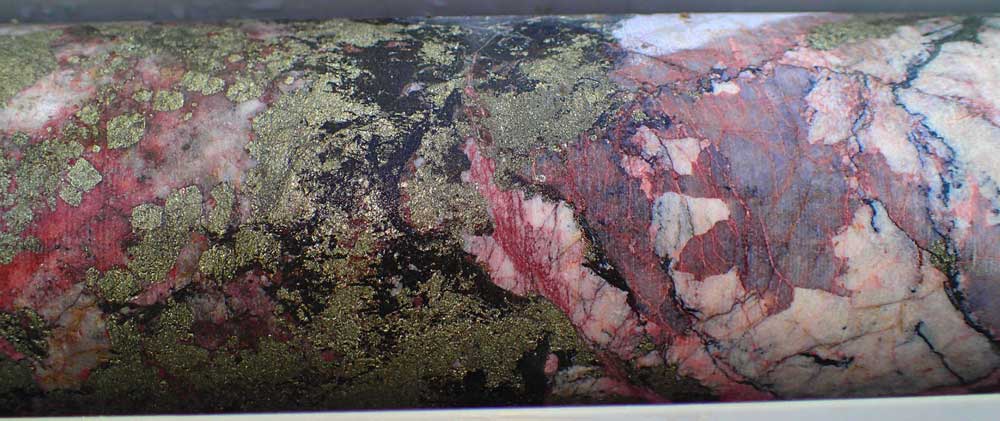 Figure 4. Example of solid drill core from diamond hole HWDD0002, showing close-up example of a spectacular, sulphide-rich carbothermal unit at a depth of 83m.