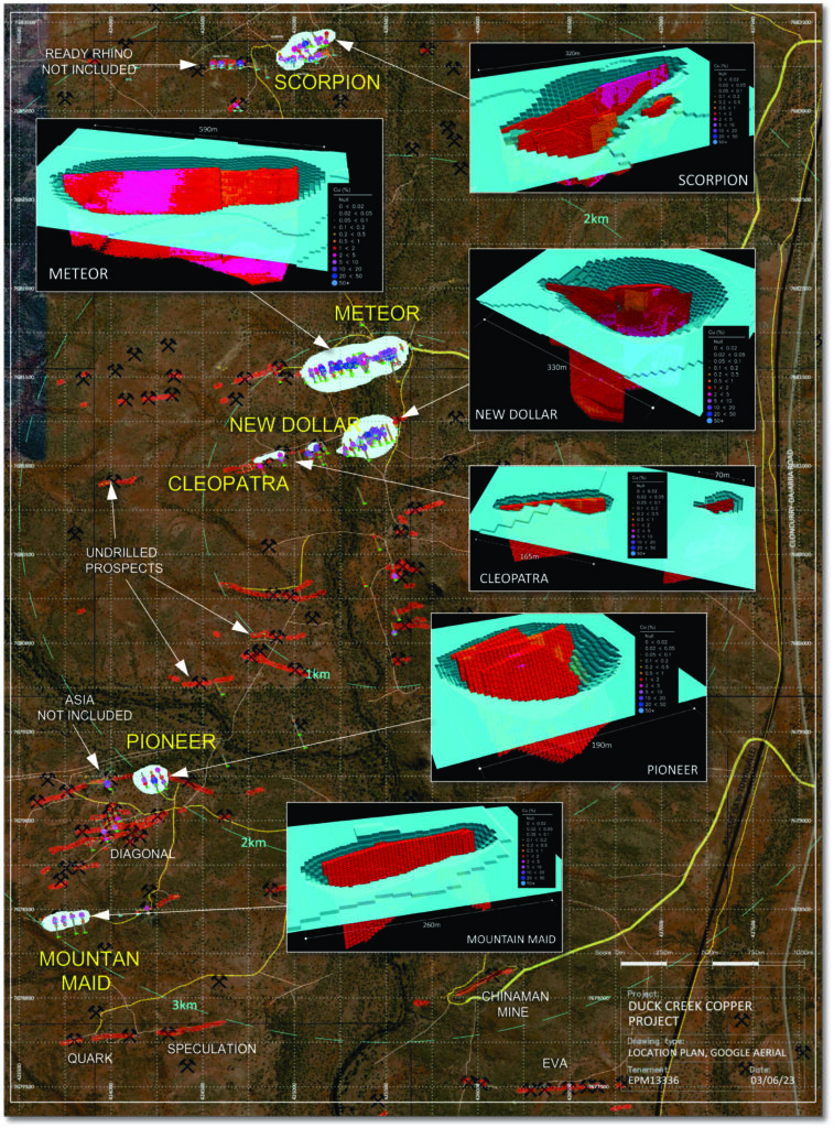 Transition’s DCCP includes over 200 high-priority targets. Twenty prospects have been drill-tested in total and require follow-up drilling. Six prospects were included in the July 2023 MRE, including Meteor, New Dollar, Cleopatra, Scorpion, Pioneer and Mountain Maid. Preliminary pit optimisation is shown for each. Also shown are prosects (cross-picks) and important zones of mapped surface mineralisation (light red).